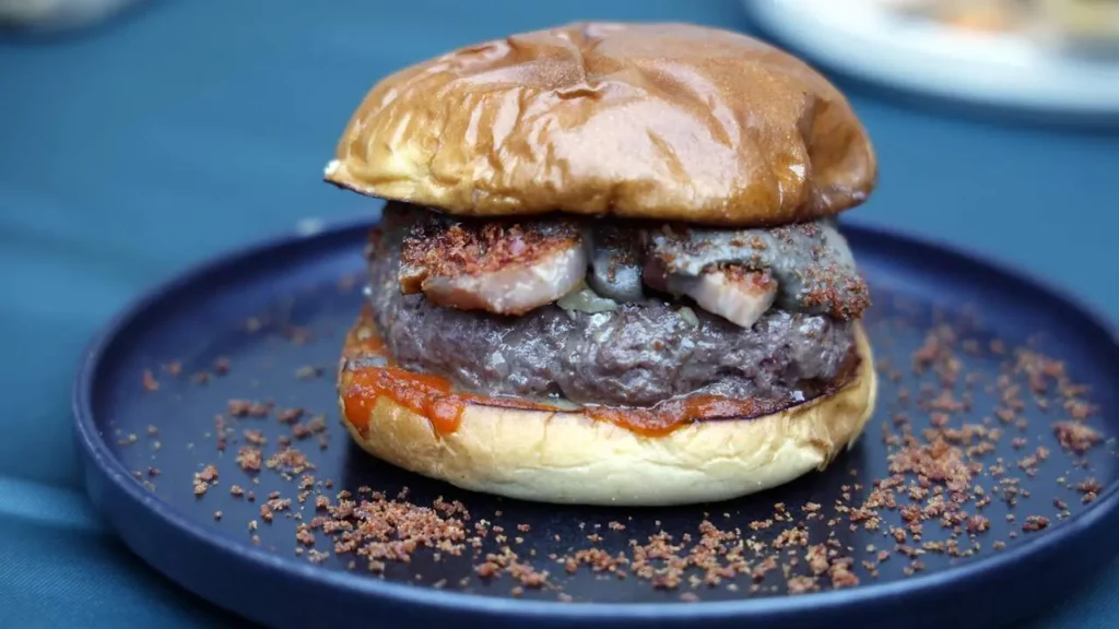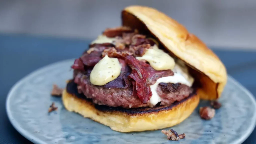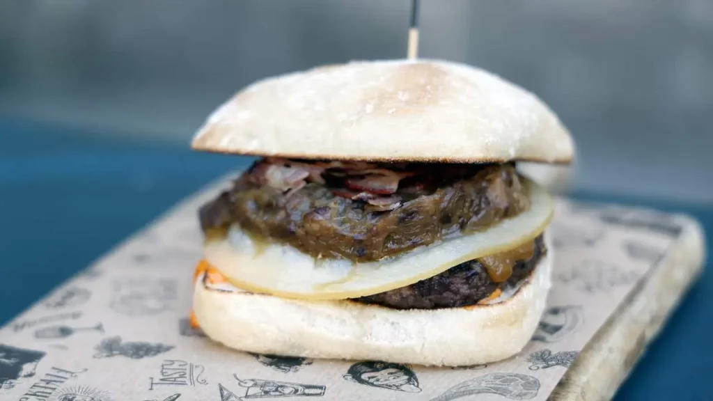 Los vigueses de Paparrúa presentaron una hamburguesa de vaca madurada; carpaccio de entrecot de vaca vieja; crema de burrata y albahaca; guanciale crujiente y salsa de pimiento de Padrón, en brioche tostado con mantequilla de tomate seco.